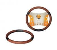 Модель оплетки из искусственной кожи имеет диаметр 38 см, а также стильную расцветку, сочетающую коричневый и черный цвет. Оплетка надежно фиксируется на руле автомобиля и предохраняет его от появления дефектов различного уровня.