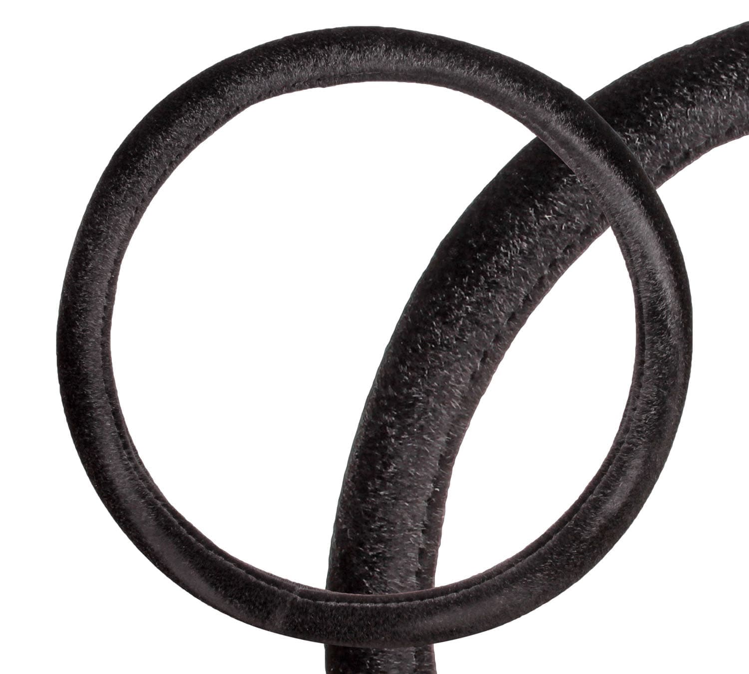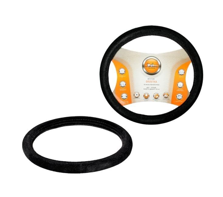 Оплетка изготовлена из искусственного меха с коротким ворсом черного цвета. Диаметр изделия равен 38 см. При установке оплетка плотно прижата к рулю и предохраняет его от механических повреждений и выцветания. Изделие помогает увеличить уровень комфорта при вождении машиной.