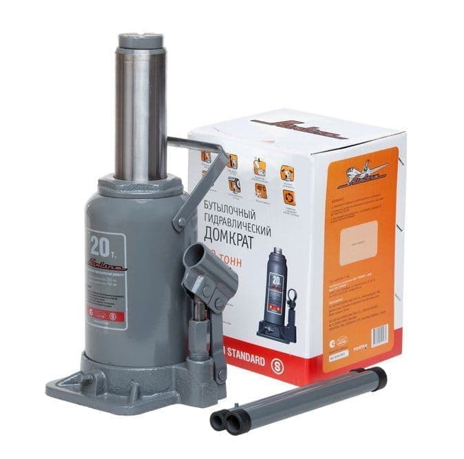 Бутылочные домкраты обладают самыми компактными размерами и простейшей схемой функционирования. Занимает мало места и не требует особых знаний в использовании. Единственное требование – хранение и транспортировка в вертикальном положении. Бутылочные домкраты имеют самый широкий модельный ряд (от 2 до 32т), что делает их незаменимыми при необходимости поднять грузовик или автобус.