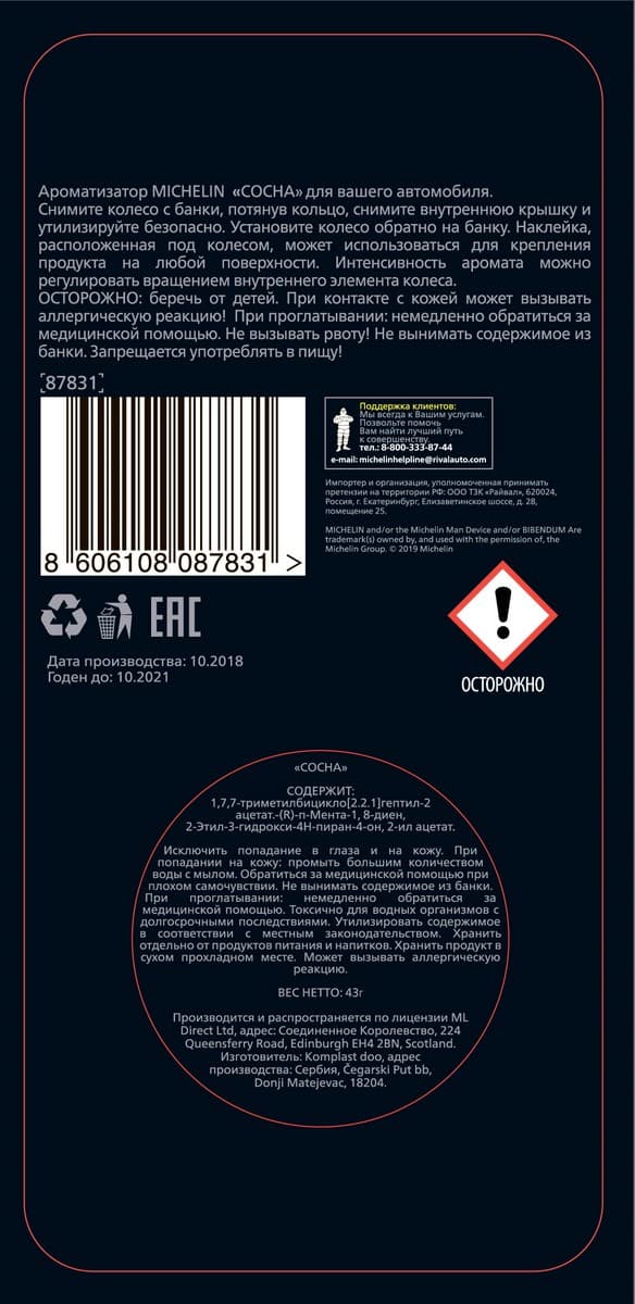 Ароматизатор воздуха MICHELIN, банка в форме шины 48 гр. (30 мл.) "сосна" № 87831