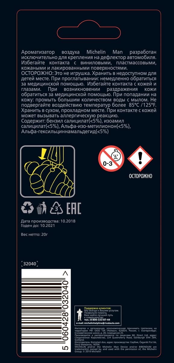 Ароматизатор воздуха MICHELIN 3D Бибендум, крепление на дефлектор "океанская свежесть" № 32040