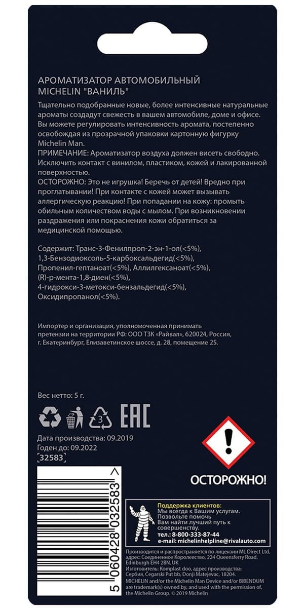 Ароматизатор воздуха MICHELIN, подвесной, картонный, 2D Classic, "ваниль" № 32583