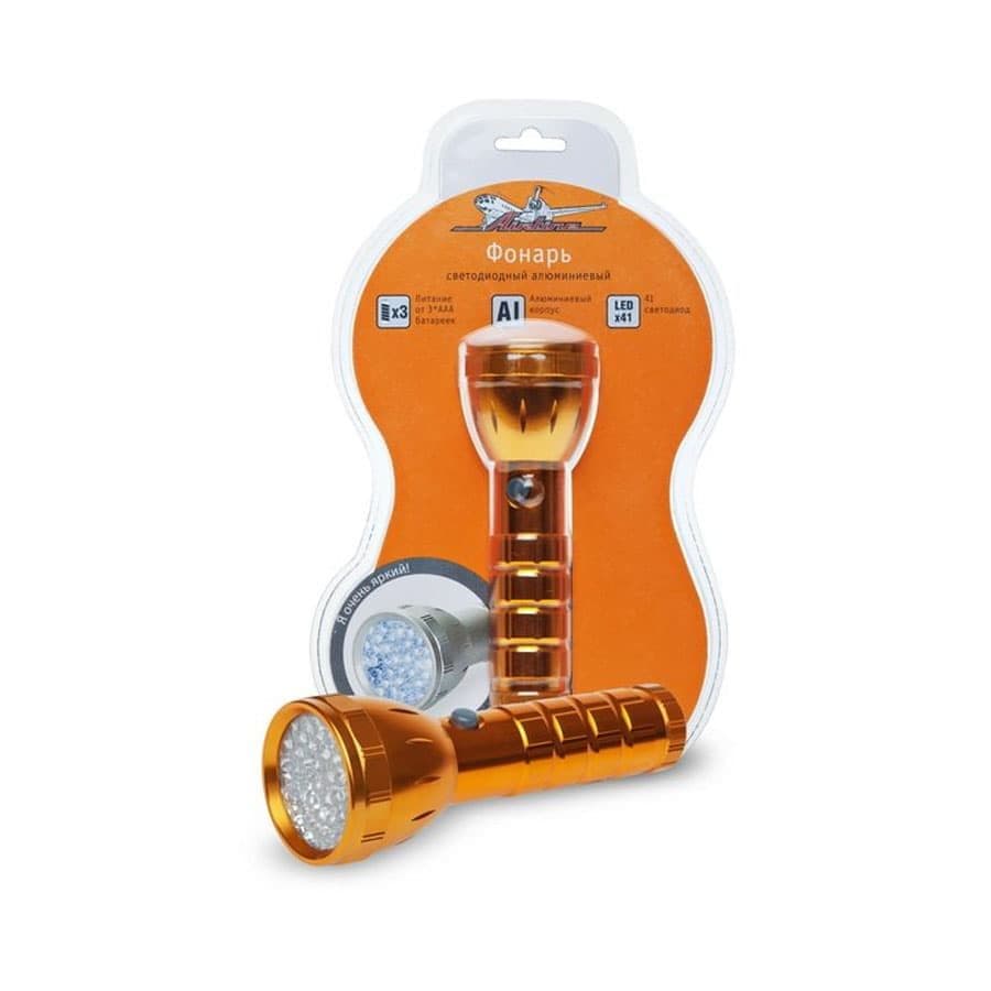 Алюминиевый фонарь, с ярким и мощным источником света (41 светодиод). Фонарь имеет алюминиевый корпус ярко-оранжевого цвета. Изделие питается от 3х батареек типа AAA.