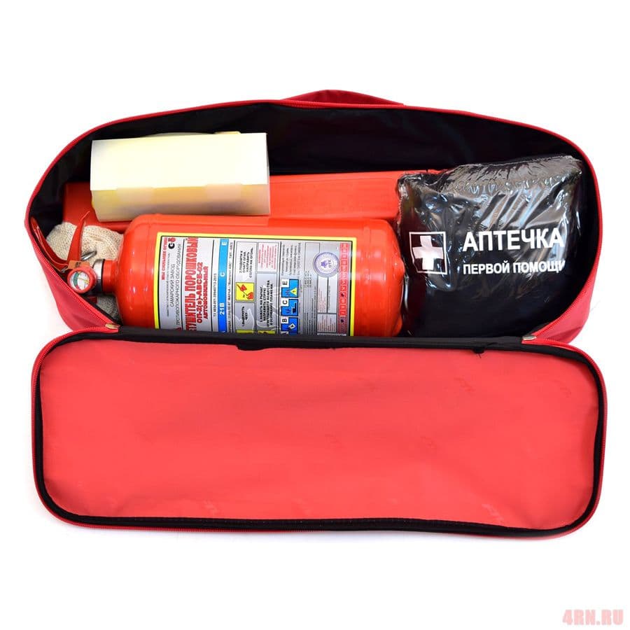 Аварийный комплект "СТАНДАРТ 3S+" (красная нейлоновая сумка, огнетушитель ОП-2(з), аптечка, знак аварийной остановки (Евростандарт), трос 3т., перчатки х/б).