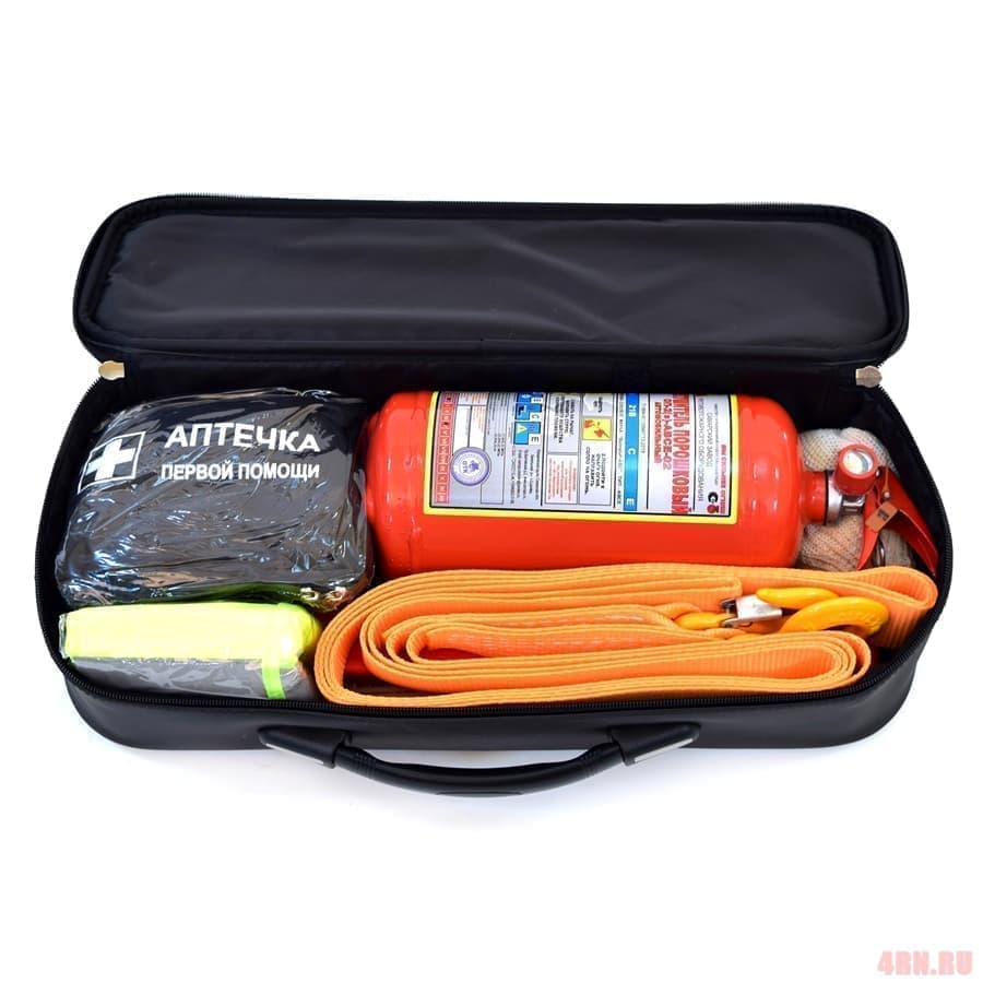 Аварийный комплект "ЭКСТРА-2"Закрытая кожаная сумка, огнетушитель ОП-2(з), аптечка в мягком футляре, знак аварийной остановки(Евростандарт), трос-лента проф.5т, перчатки.