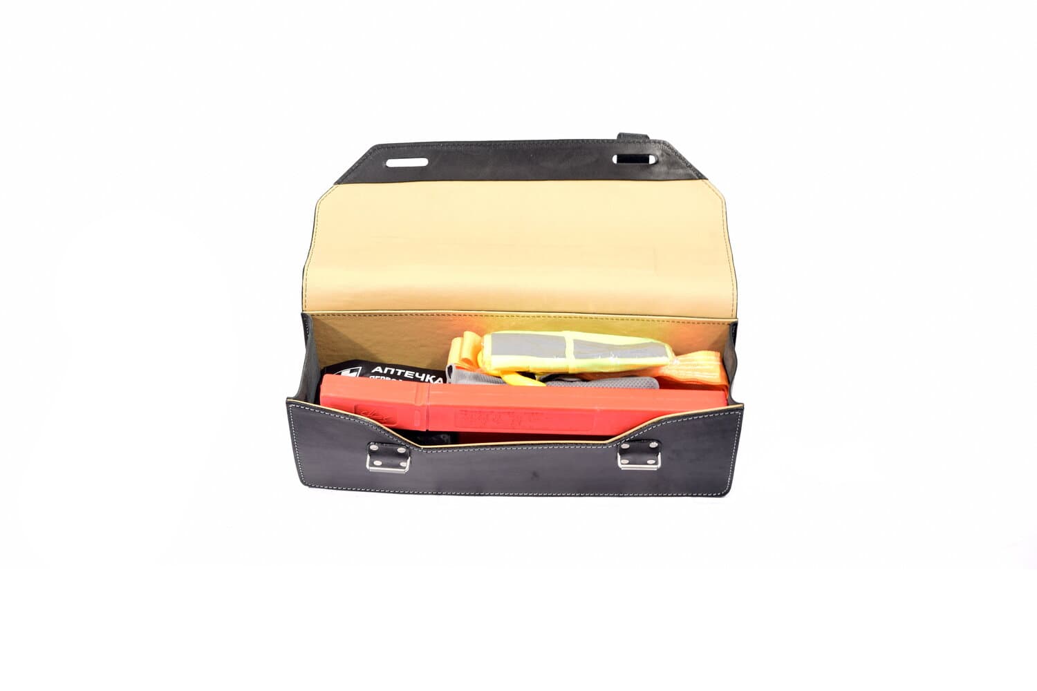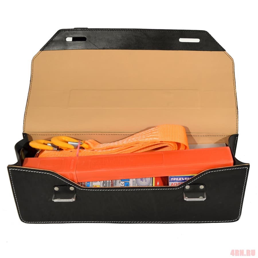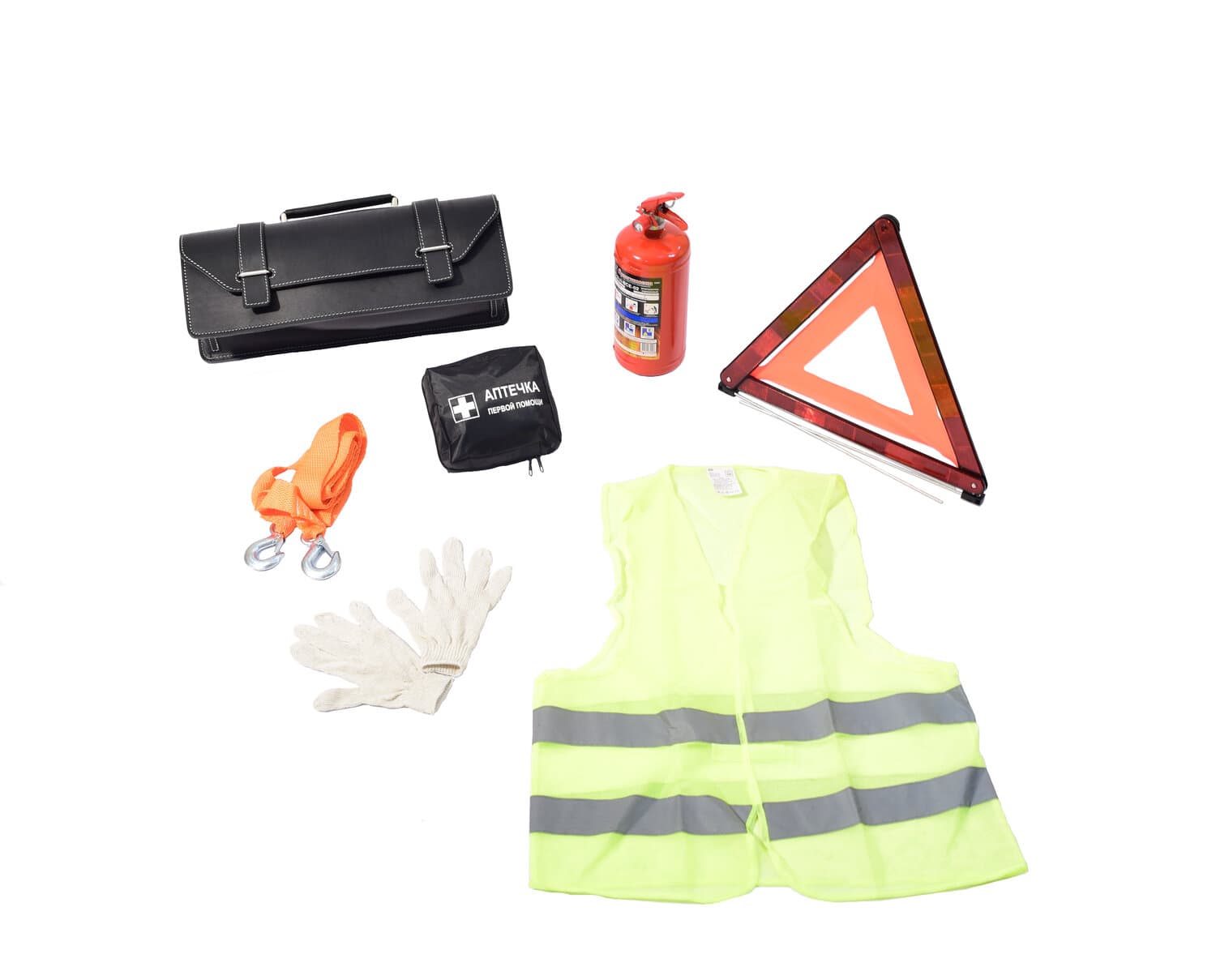 Аварийный комплект "02ВИП" Саквояж из натуральной кожи, огнетушитель ОП-2(з), аварийный знак (евростандарт), аптечка,трос 5т, перчатки х/б.