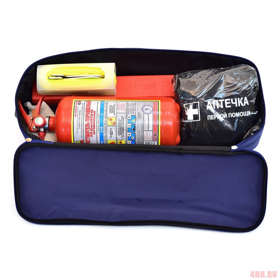 Аварийный комплект "СТАНДАРТ 3S+" (синяя нейлоновая сумка, огнетушитель ОП-2(з), аптечка, знак аварийной остановки (Евростандарт), трос 3т., перчатки х/б)