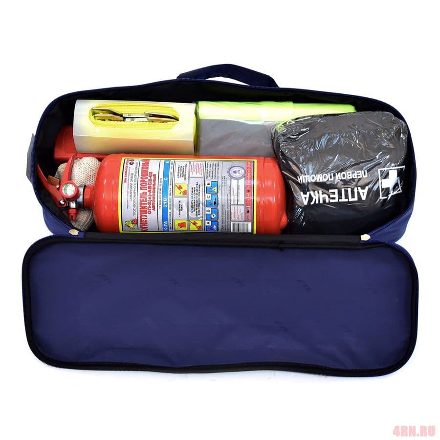 Аварийный комплект "СТАНДАРТ 3S+" (синяя нейлоновая сумка, огнетушитель ОП-2(з), аптечка, знак аварийной остановки (Евростандарт), трос 3т., перчатки х/б)