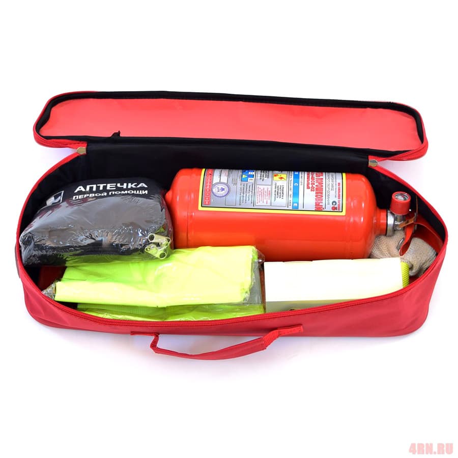 Аварийный комплект "СТАНДАРТ 3S+" (красная нейлоновая сумка, огнетушитель ОП-2(з), аптечка, знак аварийной остановки (Евростандарт), трос 3т., перчатки х/б).