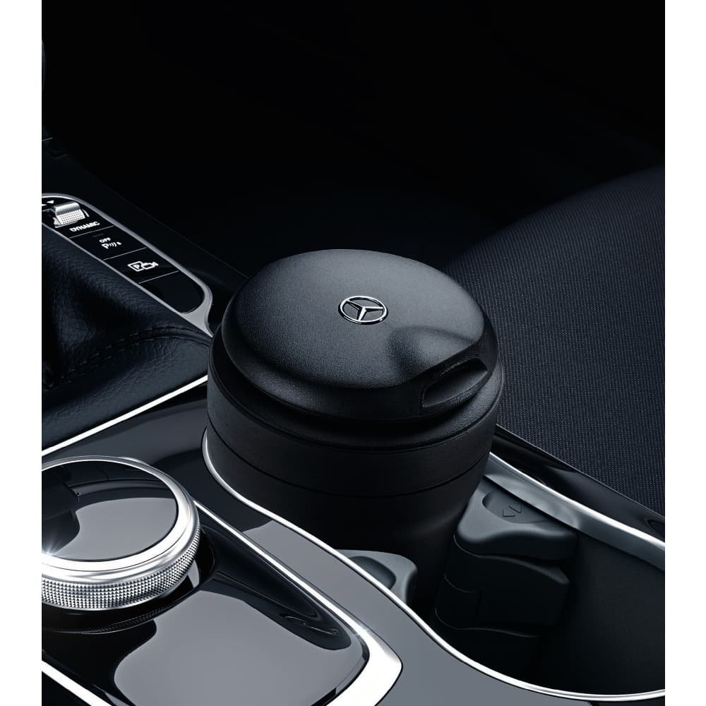 Пепельница, черная. Из жаростойких материалов. В подстаканнике или дверном вещевом отсеке. Большая вместимость. Включая тушитель сигарет