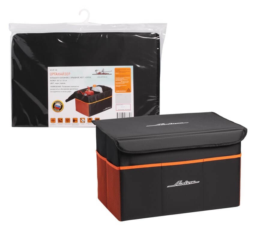 Органайзер предназначен для обеспечения порядка в багажнике автомобиля. Данная модель-это самый большой органайзер в своей линейке. Имеет верхнюю крышку и способен скрыть в себе 5л. бутылки или канистры, а так же все необходимые в дороге вещи. Органайзер изготовлен из высококачественного полиэстера, имеет ручки для переноски и наружные карманы для мелочей.