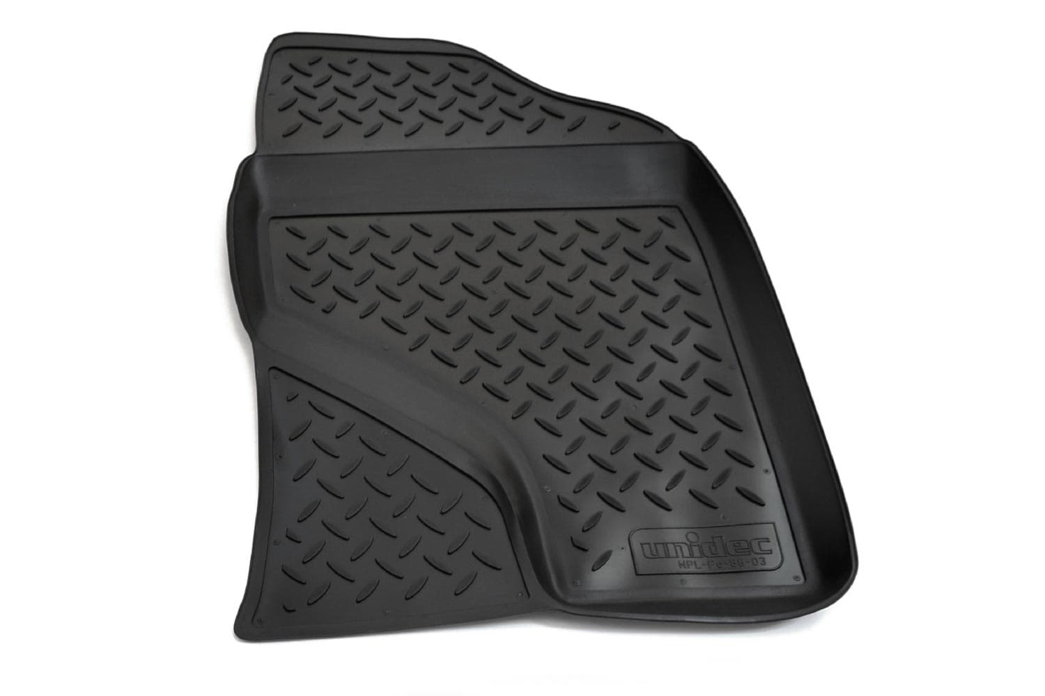 Имеют не скользящую поверхность и обеспечивают безопасное управление автомобилем, а также контролем ситуации на дороге. Изготавливаются из полиуретана, который по всем своим характеристикам превосходит резину. Во-первых, он обладает гораздо большим диапазоном твердости. Во-вторых, меньше подвержен стиранию и эластичен. В-третьих, он менее подвержен разрыву и деформациям. Коврик стоек к маслу, бензину и кислотам.