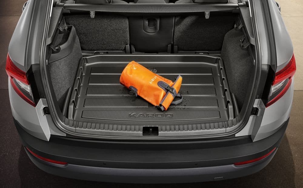 Вместительный багажный отсек ŠKODA KAROQ позволяет перевозить самые разнообразные предметы. Предназначенный для защиты багажного отделения от попадания влаги и грязи, специальный пластиковый поддон является идеальным решением для транспортировки ваших грузов. Боковые стенки (достаточно высокие) предотвращают проливание жидкостей и их последующее проникновение на пол транспортного средства. Практичность поддона повышается за счет применения алюминиевой перегородки для разделения и фиксации перевозимых предметов. Идеально копируя форму багажного пространства, поддон не нуждается в дополнительной фиксации, что позволяет без труда его вынуть, а затем очистить с помощью обычных моющих средств.