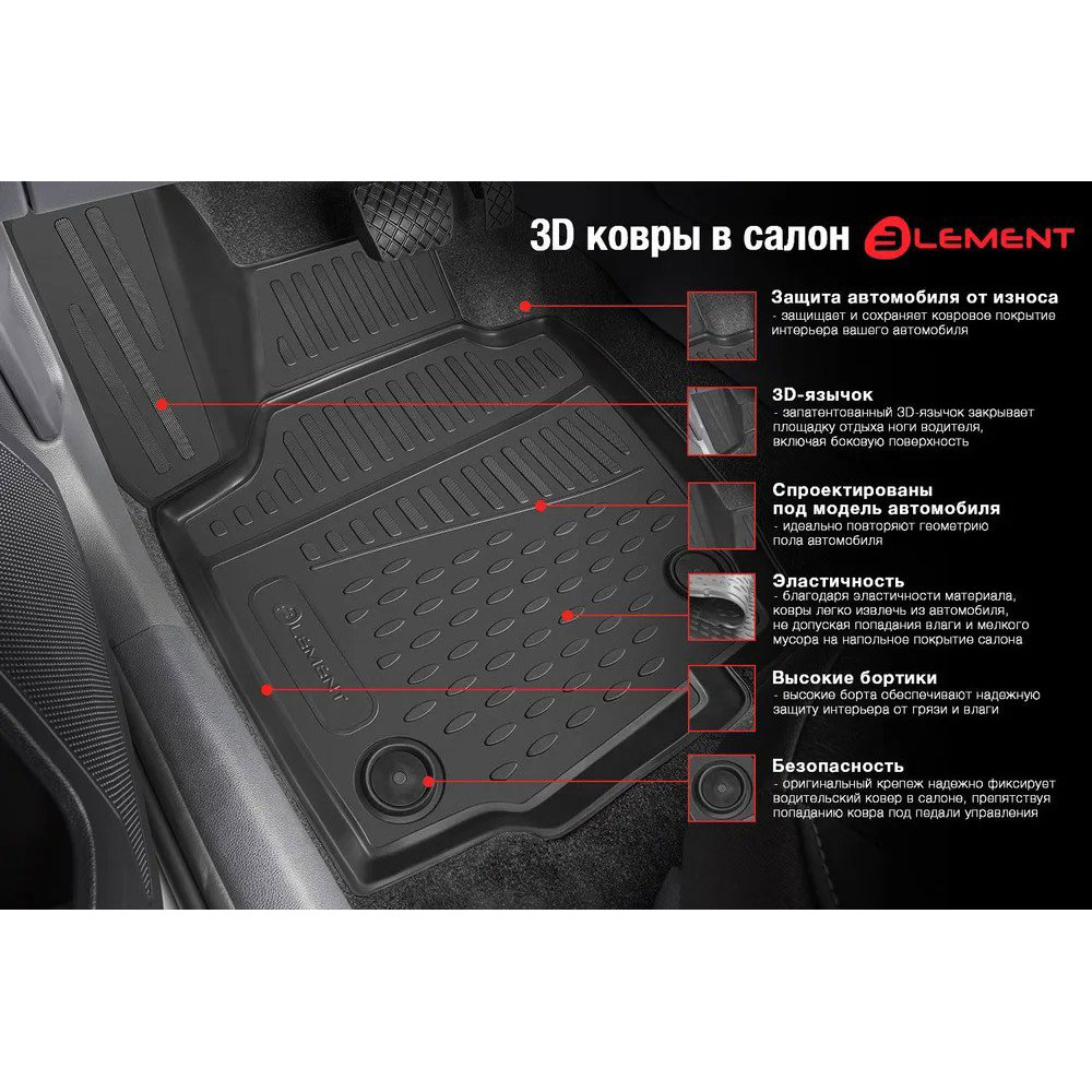 Защита салона автомобиля от загрязнения и влаги - это основная функция ковров Элемент. Достигается за счет высоких бортов, перемычки на тоннель заднего ряда сидений, элементов формы и текстуры, свойств материала, а также запатентованной технологией 3D-перемычки в зоне отдыха ноги водителя, что обеспечивает дополнительную защиту, сохраняя салон автомобиля в первозданном виде.