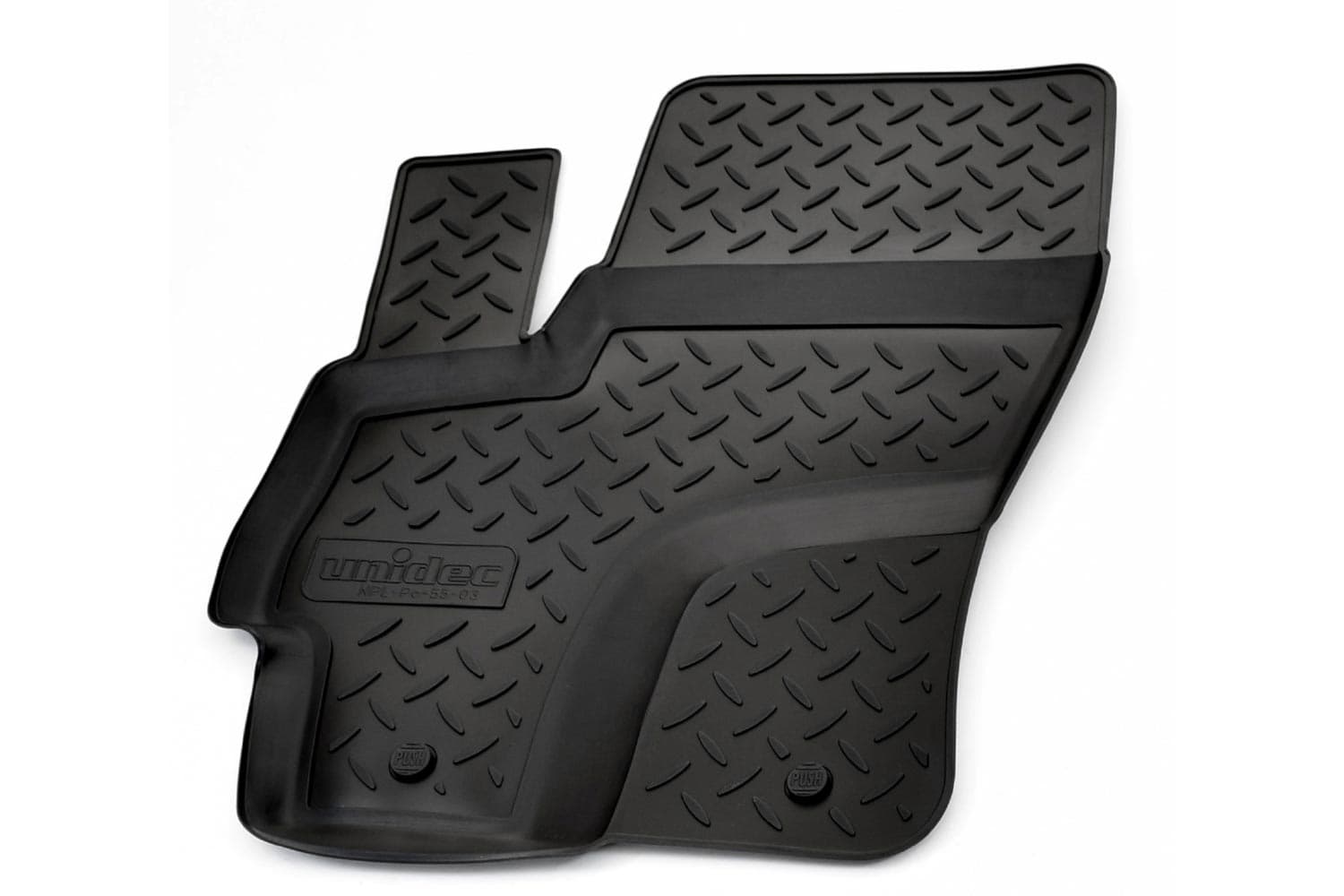 Имеют не скользящую поверхность и обеспечивают безопасное управление автомобилем, а также контролем ситуации на дороге. Изготавливаются из полиуретана, который по всем своим характеристикам превосходит резину. Во-первых, он обладает гораздо большим диапазоном твердости. Во-вторых, меньше подвержен стиранию и эластичен. В-третьих, он менее подвержен разрыву и деформациям. Коврик стоек к маслу, бензину и кислотам.
