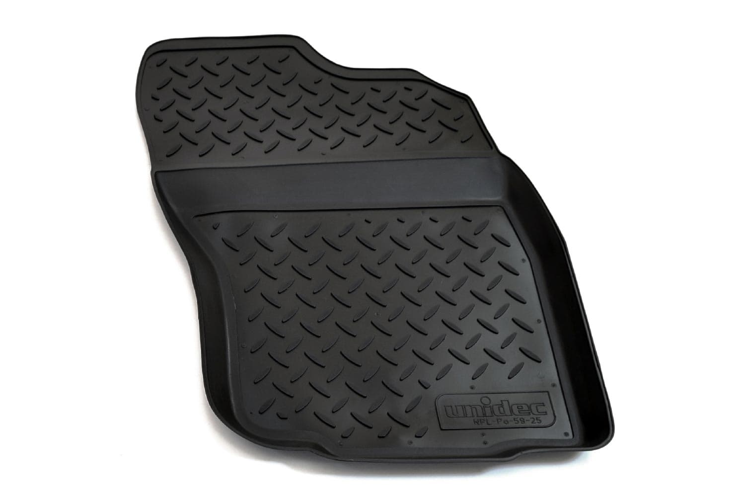 Имеют не скользящую поверхность и обеспечивают безопасное управление автомобилем, а также контролем ситуации на дороге. Изготавливаются из полиуретана, который по всем своим характеристикам превосходит резину. Во-первых, он обладает гораздо большим диапазоном твердости. Во-вторых, меньше подвержен стиранию и эластичен. В-третьих, он менее подвержен разрыву и деформациям. Коврик стоек к маслу, бензину и кислотам.