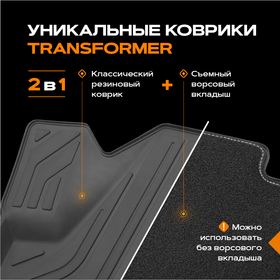 В ковриках Transformer используется высококачественное полипропиленовое волокно и эластичная водонепроницаемая вторичная основа обеспечивает непромокаемость, износостойкость и высокую влагопоглощающую способность изделия.