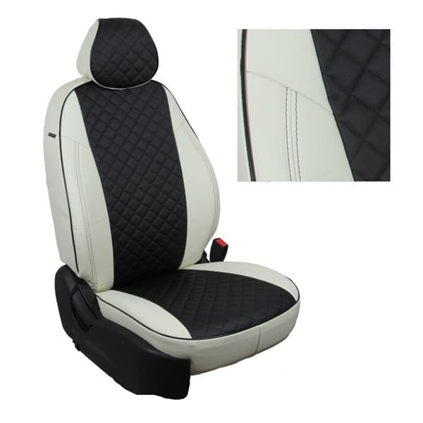 Материал: экокожа; цвет: бело-черный; узор: ромб; особенности салона: заднее сиденье и спинка сплошные