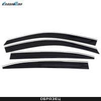 Дефлекторы устанавливаются на внешние рамки дверей с помощью скотча 3М и специальных оригинальных креплений. Изготавливаются из акрилового стекла литьевым способом. Поставляются с хромированным молдингом.