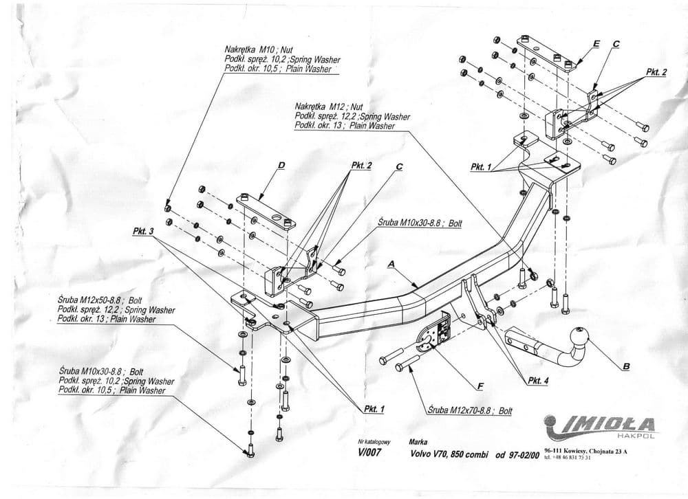 Польский фаркоп Imiola с условно съемным крюком на 2-х болтах (тип шара A), вырез в бампере при установке не нужен, электрика в комплекте, максимально разрешенная масса прицепа 1800 кг.