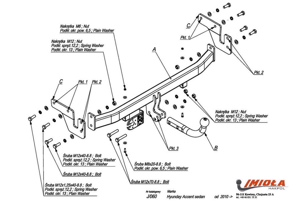 Польский фаркоп Imiola с условно съемным крюком на 2-х болтах (тип шара A), вырез в бампере при установке нужен, электрика в комплекте, максимально разрешенная масса прицепа 1200 кг.