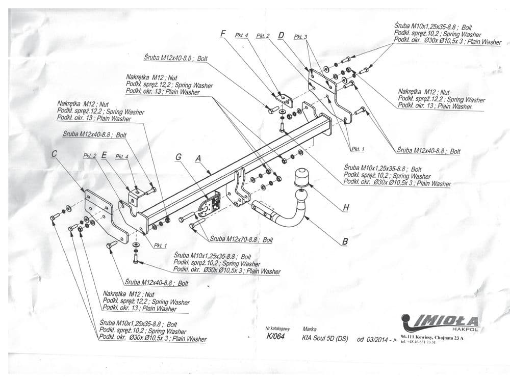 Польский фаркоп Imiola с условно съемным крюком на 2-х болтах (тип шара A), вырез в бампере при установке нужен, электрика приобретается отдельно, максимально разрешенная масса прицепа 1400 кг.