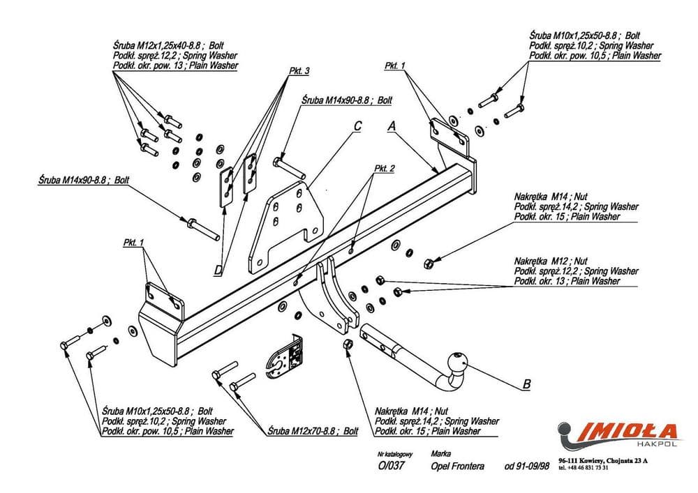 Польский фаркоп Imiola с условно съемным крюком на 2-х болтах (тип шара A), вырез в бампере при установке не нужен, электрика в комплекте, максимально разрешенная масса прицепа 1950 кг.
