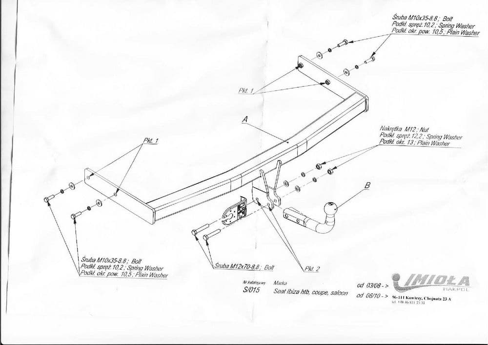 Польский фаркоп Imiola с условно съемным крюком на 2-х болтах (тип шара A), вырез в бампере при установке не нужен, электрика приобретается отдельно, максимально разрешенная масса прицепа 1200 кг.