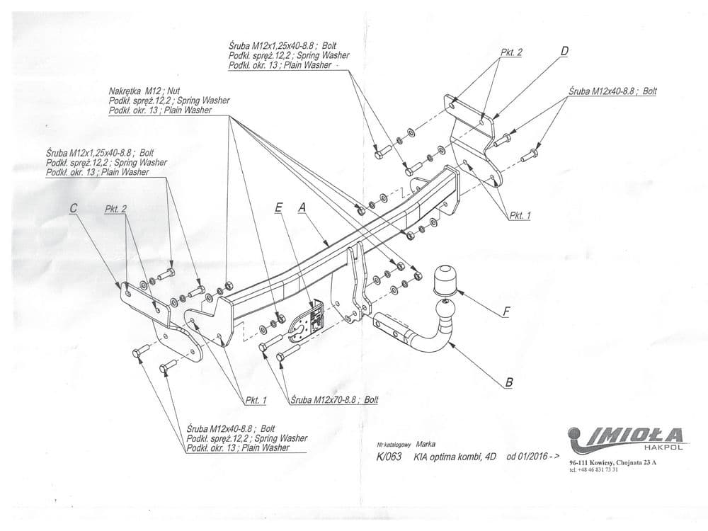 Польский фаркоп Imiola с условно съемным крюком на 2-х болтах (тип шара A), вырез в бампере при установке нужен, электрика приобретается отдельно, максимально разрешенная масса прицепа 1800 кг.