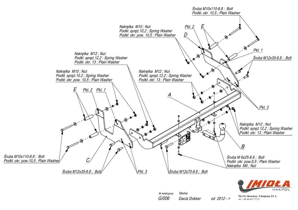 Польский фаркоп Imiola с условно съемным крюком на 2-х болтах (тип шара A), вырез в бампере при установке не нужен, электрика приобретается отдельно, максимально разрешенная масса прицепа 1200 кг.