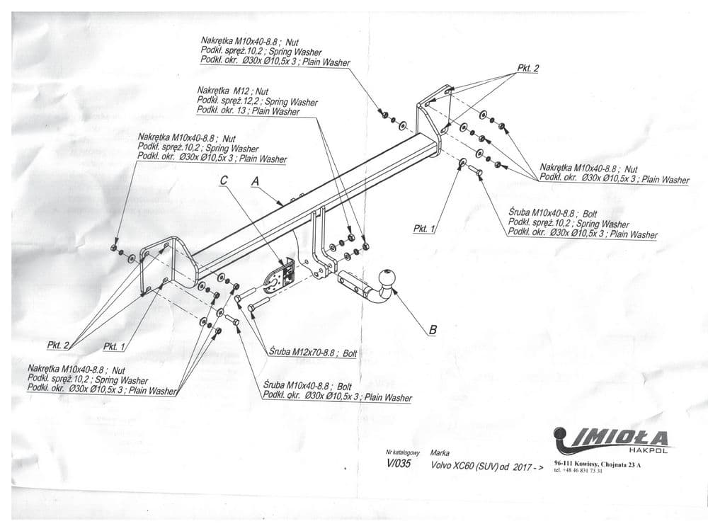 Польский фаркоп Imiola с условно съемным крюком на 2-х болтах (тип шара A), вырез в бампере при установке не нужен, электрика приобретается отдельно, максимально разрешенная масса прицепа 2400 кг.