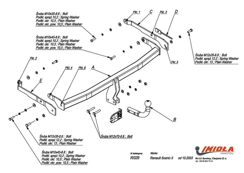 Польский фаркоп Imiola с условно съемным крюком на 2-х болтах (тип шара A), вырез в бампере при установке нужен, электрика в комплекте, максимально разрешенная масса прицепа 1350 кг.