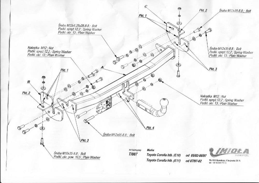 Польский фаркоп Imiola с условно съемным крюком на 2-х болтах (тип шара A), вырез в бампере при установке не нужен, электрика в комплекте, максимально разрешенная масса прицепа 1200 кг.