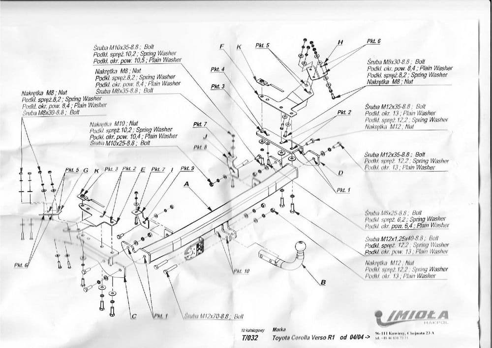 Польский фаркоп Imiola с условно съемным крюком на 2-х болтах (тип шара A), вырез в бампере при установке нужен, электрика в комплекте, максимально разрешенная масса прицепа 1450 кг.