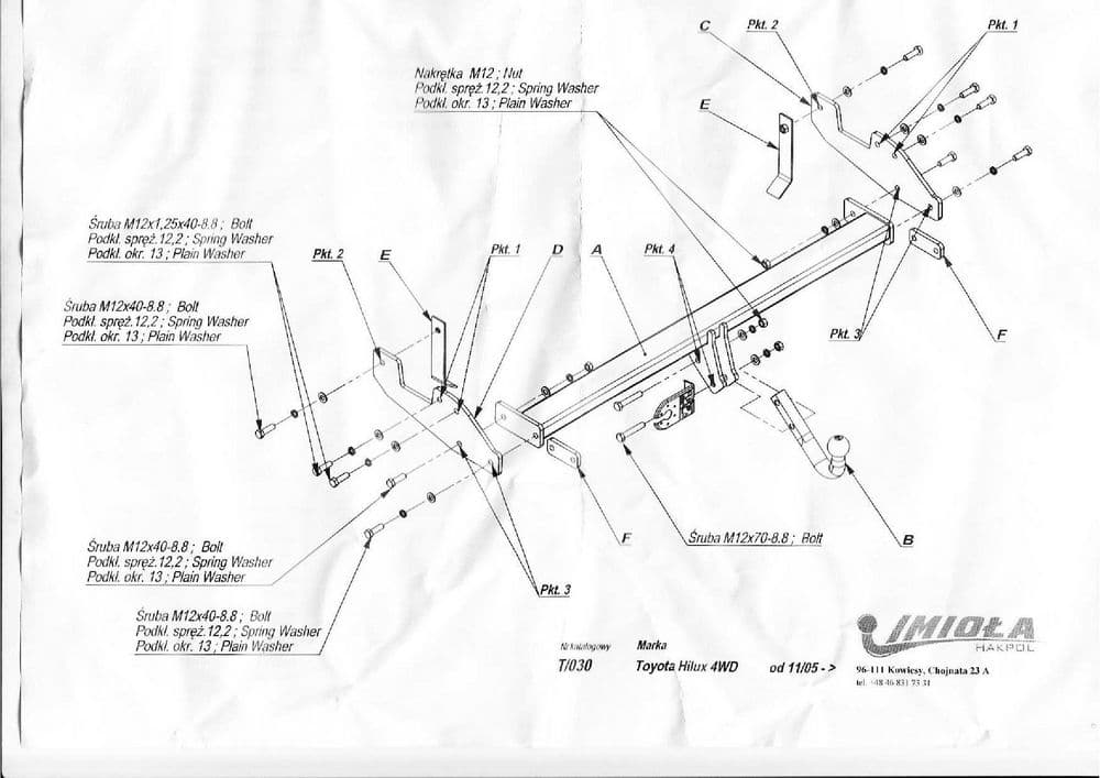 Польский фаркоп Imiola с условно съемным крюком на 2-х болтах (тип шара A), вырез в бампере при установке не нужен, электрика в комплекте, максимально разрешенная масса прицепа 2500 кг.
