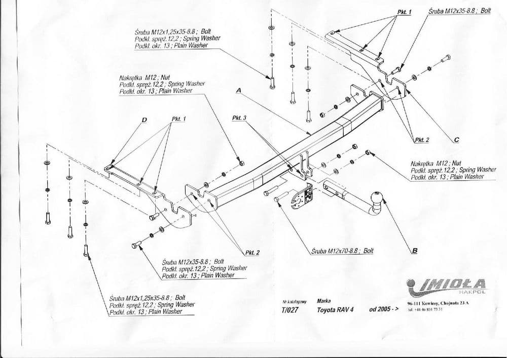 Польский фаркоп Imiola с условно съемным крюком на 2-х болтах (тип шара A), вырез в бампере при установке не нужен, электрика в комплекте, максимально разрешенная масса прицепа 2050 кг.