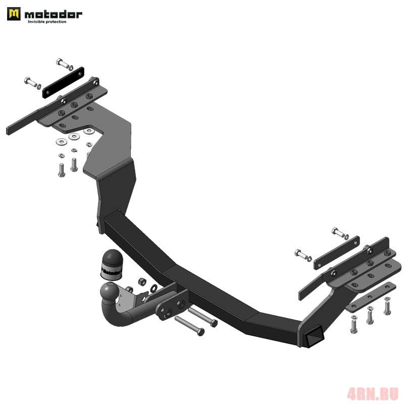 Российский фаркоп Мотодор с с условно съемным крюком на 2-х болтах (тип шара A), вырез в бампере при установке не нужен, электрика приобретается отдельно, максимально разрешенная масса прицепа 2000 кг.