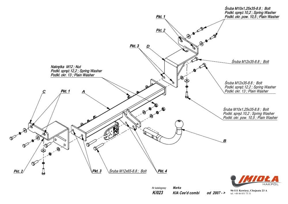Польский фаркоп Imiola с условно съемным крюком на 2-х болтах (тип шара A), вырез в бампере при установке не нужен, электрика в комплекте, максимально разрешенная масса прицепа 1600 кг.
