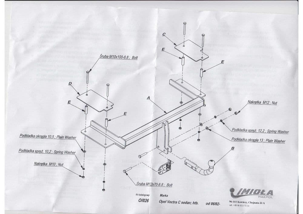 Польский фаркоп Imiola с условно съемным крюком на 2-х болтах (тип шара A), вырез в бампере при установке не нужен, электрика в комплекте, максимально разрешенная масса прицепа 1950 кг.