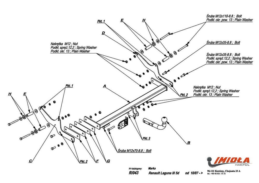 Польский фаркоп Imiola с условно съемным крюком на 2-х болтах (тип шара A), вырез в бампере при установке не нужен, электрика приобретается отдельно, максимально разрешенная масса прицепа 1500 кг.