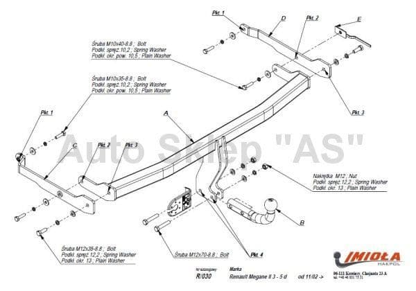 Польский фаркоп Imiola с условно съемным крюком на 2-х болтах (тип шара A), вырез в бампере при установке не нужен, электрика в комплекте, максимально разрешенная масса прицепа 1350 кг.