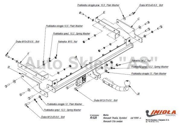 Польский фаркоп Imiola с условно съемным крюком на 2-х болтах (тип шара A), вырез в бампере при установке не нужен, электрика в комплекте, максимально разрешенная масса прицепа 1100 кг.