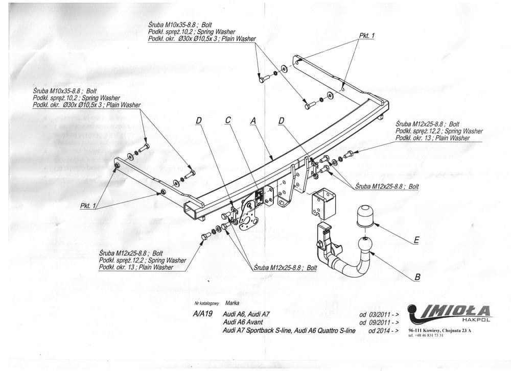 Польский фаркоп Imiola со съемным крюком вертикального крепления (тип шара V), вырез в бампере при установке не нужен, электрика приобретается отдельно, максимально разрешенная масса прицепа 2500 кг.