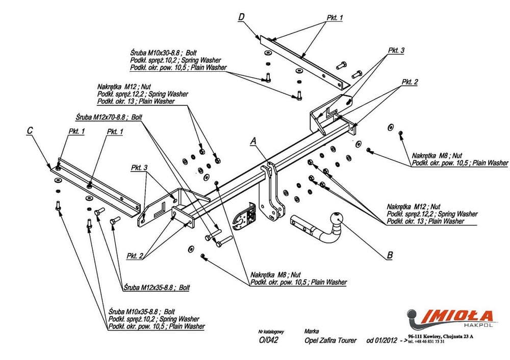 Польский фаркоп Imiola с условно съемным крюком на 2-х болтах (тип шара A), вырез в бампере при установке нужен, электрика приобретается отдельно, максимально разрешенная масса прицепа 1500 кг.