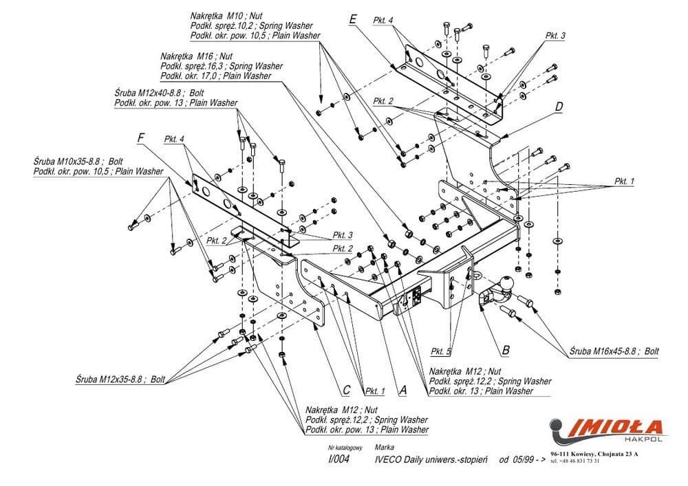Польский фаркоп Imiola с фланцевым креплением на 2-х болтах (тип шара F), вырез в бампере при установке не нужен, электрика в комплекте, максимально разрешенная масса прицепа 3500 кг.