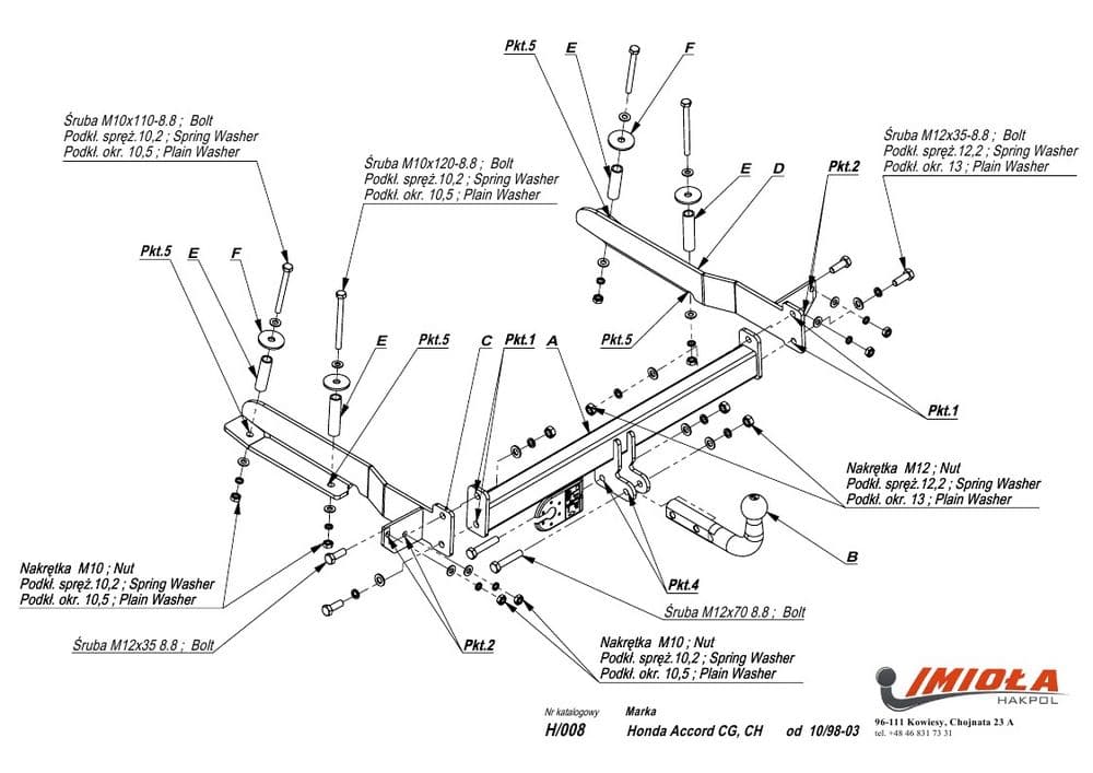 Польский фаркоп Imiola с условно съемным крюком на 2-х болтах (тип шара A), вырез в бампере при установке нужен, электрика в комплекте, максимально разрешенная масса прицепа 1600 кг.