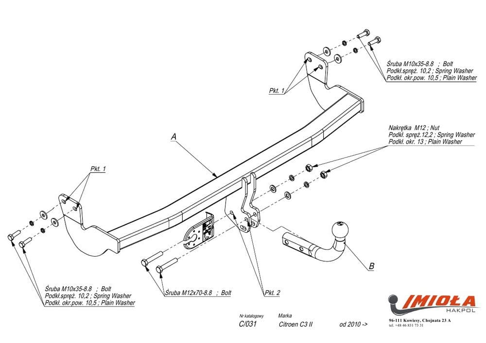 Польский фаркоп Imiola с условно съемным крюком на 2-х болтах (тип шара A), вырез в бампере при установке не нужен, электрика приобретается отдельно, максимально разрешенная масса прицепа 1225 кг.