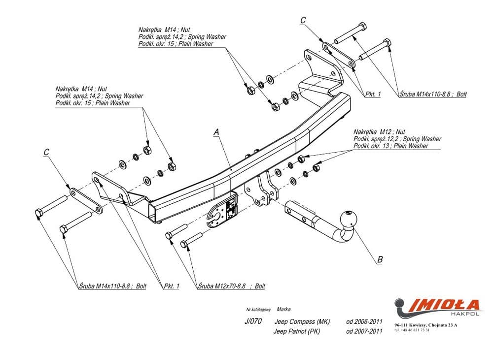 Польский фаркоп Imiola с условно съемным крюком на 2-х болтах (тип шара A), вырез в бампере при установке не нужен, электрика приобретается отдельно, максимально разрешенная масса прицепа 1500 кг.