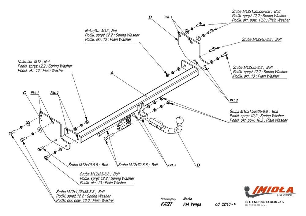 Польский фаркоп Imiola с условно съемным крюком на 2-х болтах (тип шара A), вырез в бампере при установке нужен, максимально разрешенная масса прицепа 1300 кг.