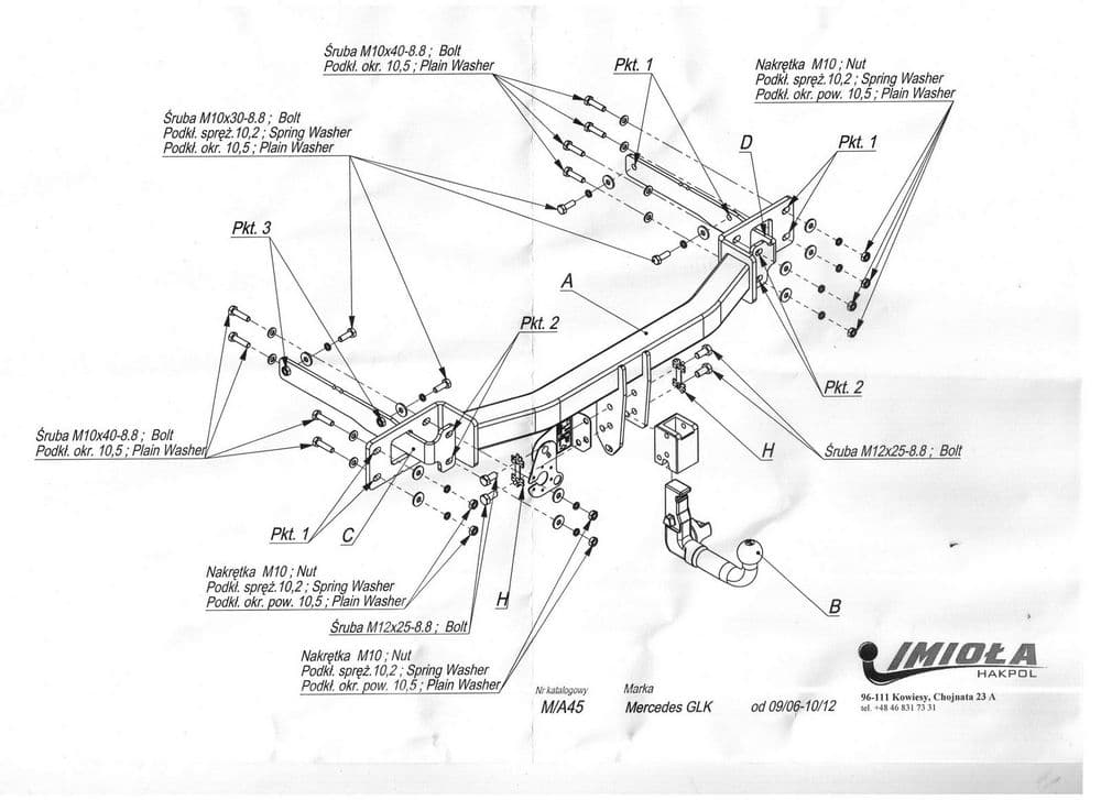 Польский фаркоп Imiola с условно съемным крюком на 2-х болтах (тип шара A), вырез в бампере при установке нужен, электрика приобретается отдельно, максимально разрешенная масса прицепа 2400 кг.
